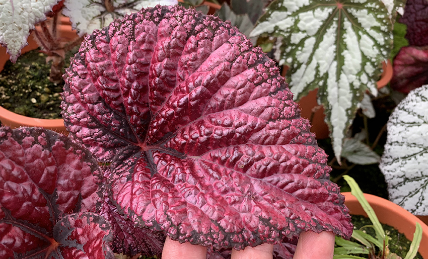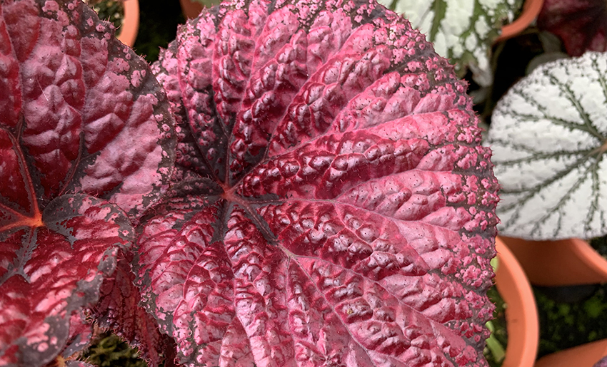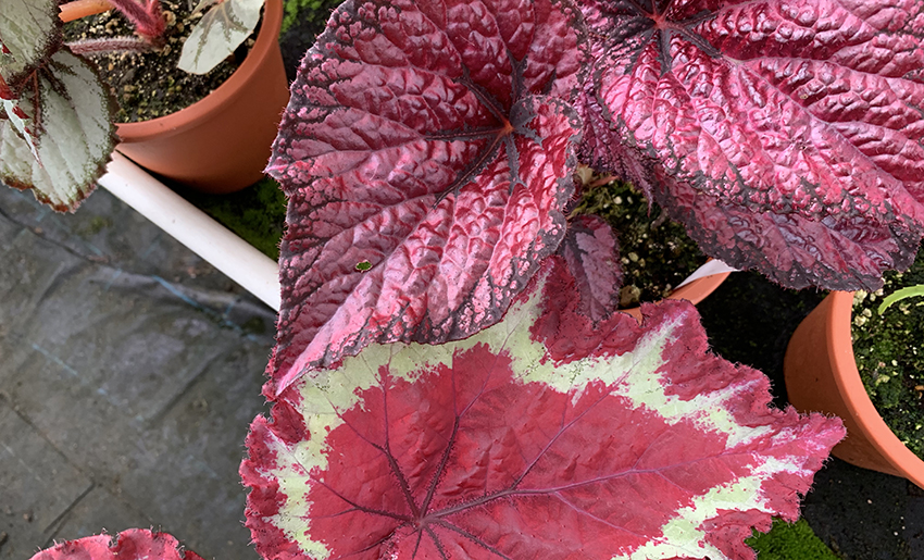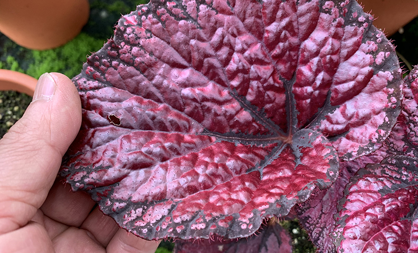 光沢のある赤い葉が特徴のレックスベゴニアです。